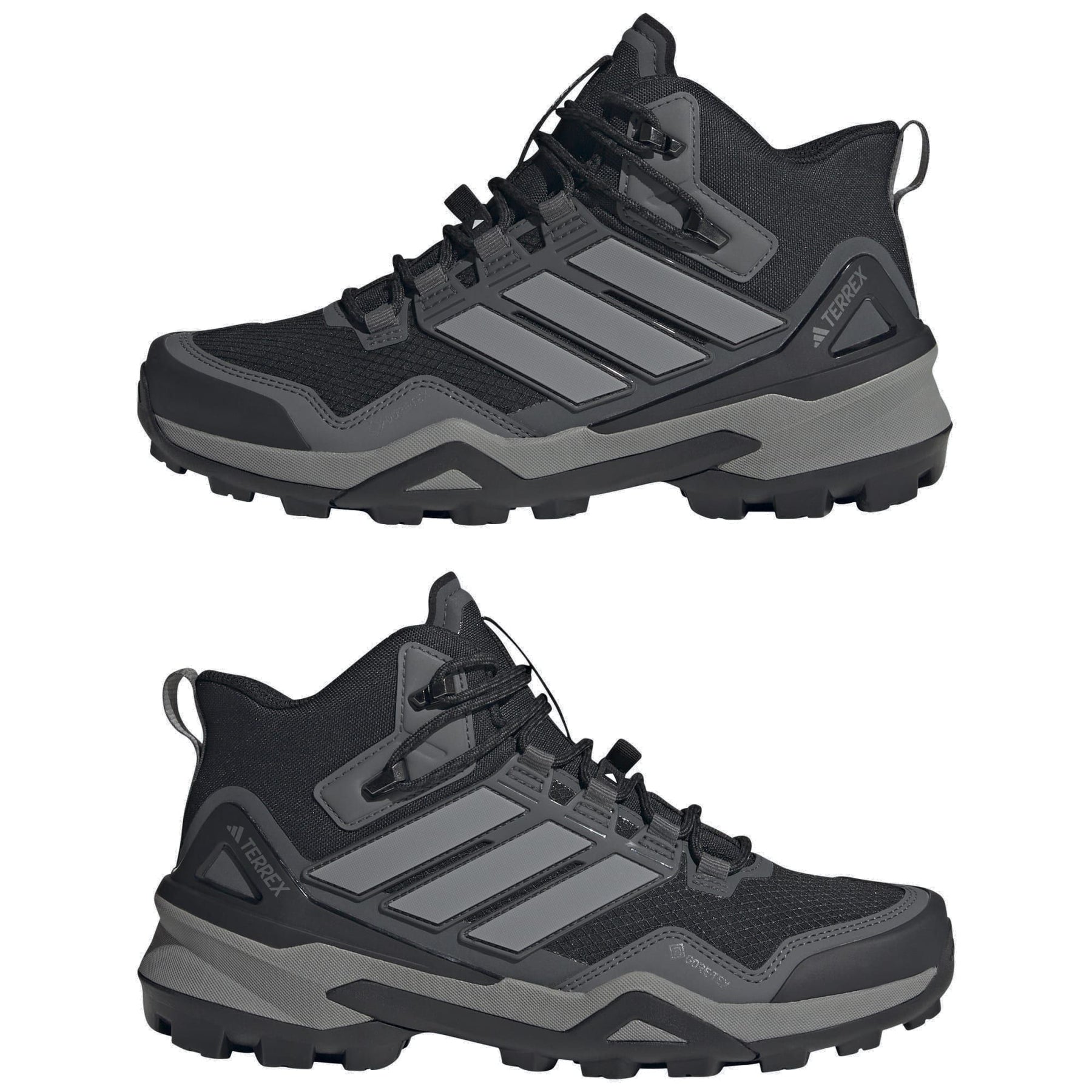Designed for hikes and rugged summit scrambles, these adidas Terrex Skychaser hiking shoes balance comfort, stability and control for moving fast on and off the trail. They combine the agile, responsive feel of trail running shoes with the support and durability of hiking shoes. Step-in comfort and a lightweight feel keep you focused on the trail ahead. The extra support of a mid-height cuff offers added stability, and a waterproof GORE-TEX EPE membrane seals out wet conditions while letting your feet breathe and regulate temperature. A ripstop upper with abrasion-resistant overlays keeps them light and durable. The all-conditions grip of Continental™ Rubber maintains traction across all surfaces, wet or dry.